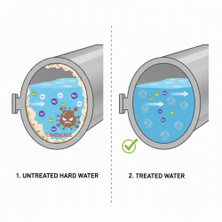 | The minerals collect within the nucleation points on each polymeric bead and form microcrystals. | After forming, the microcrystals break off from the template beads and continue through the water supply, as inert particles unable to form hard scale |