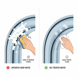 | Hardness minerals in water treated by the TAC process pass through pipework and appliances, without sticking to form hard lime-scale, beneficial to plumbing fittings and heating systems. | Where water evaporates, the water marks left behind consist of the mineral residue in crystalline form, and wipe away easily with general cleaning, not requiring aggressive descaling. |
