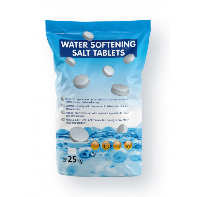 AquaHouse Water Softener Salt Tablets - 25KG Bag, premium water softening PDV Salt Tablets made from food grade salt to EN973 Type A specification. Pure white salt without any anti-caking agents or other additives. Suitable for all domestic and commercial water softeners which can use salt tablets.