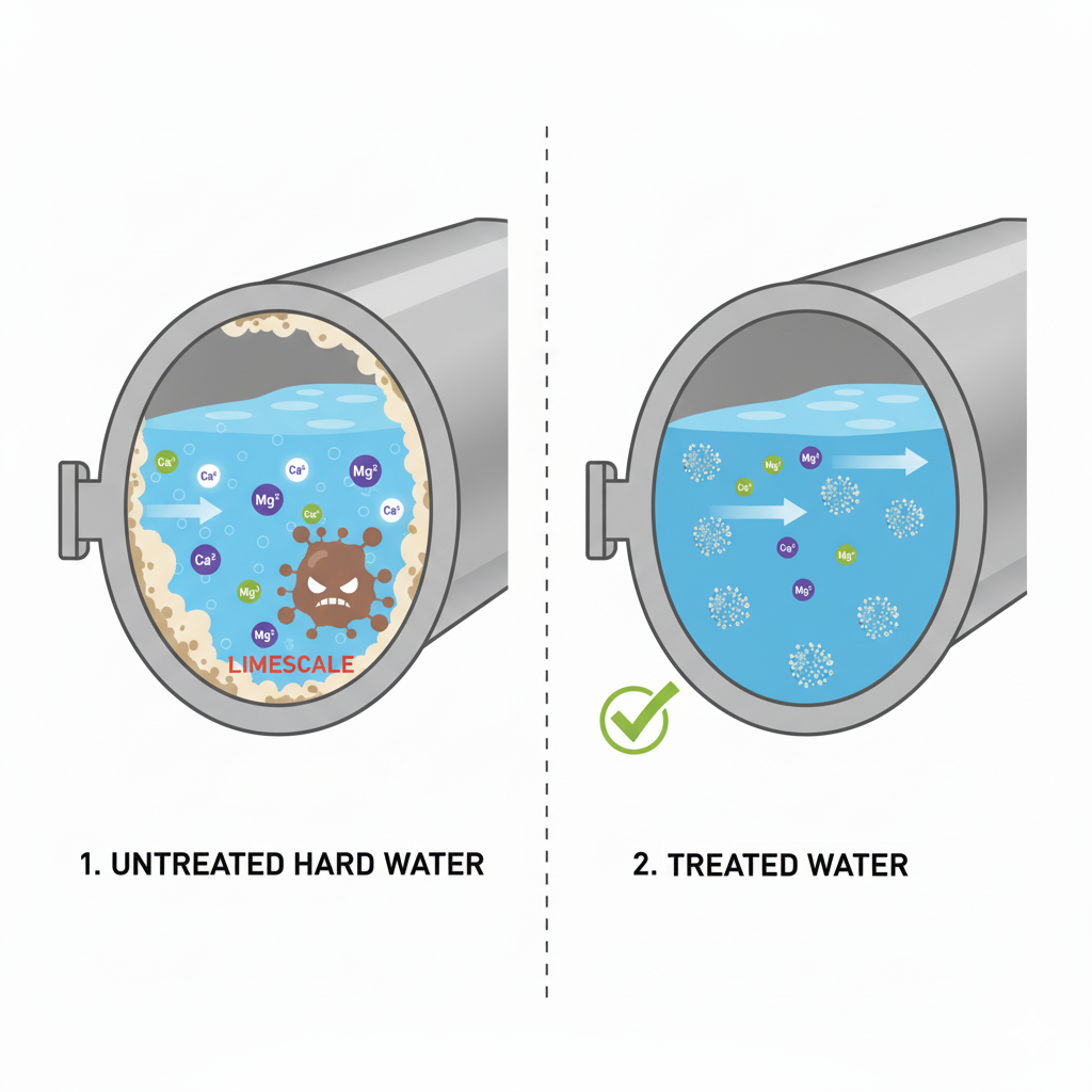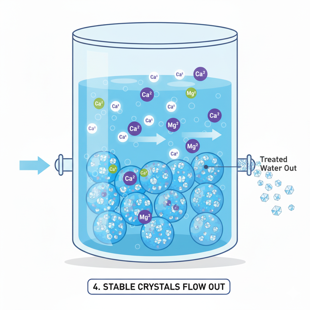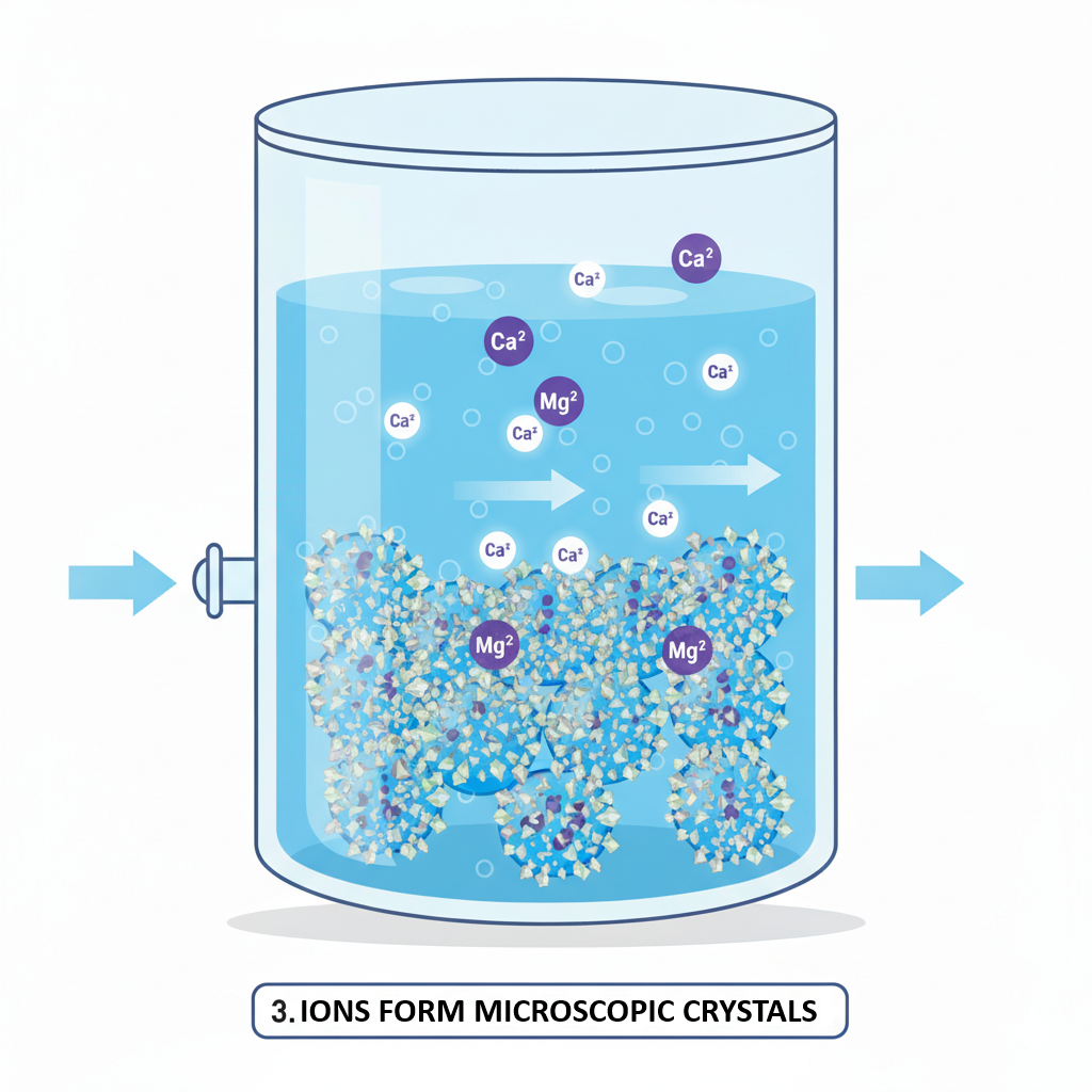 | The minerals collect within the nucleation points on each polymeric bead and form microcrystals. | After forming, the microcrystals break off from the template beads and continue through the water supply, as inert particles unable to form hard scale |